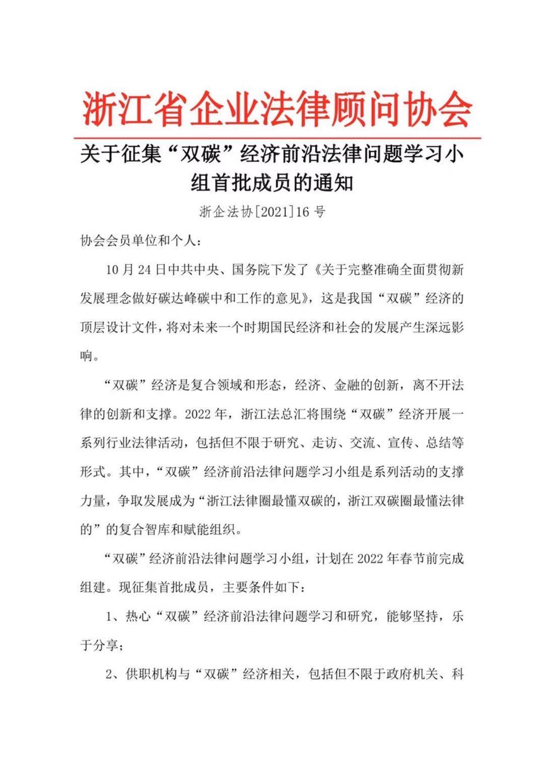 关于征集“双碳”经济前沿法律问题学习小组首批成员的通知