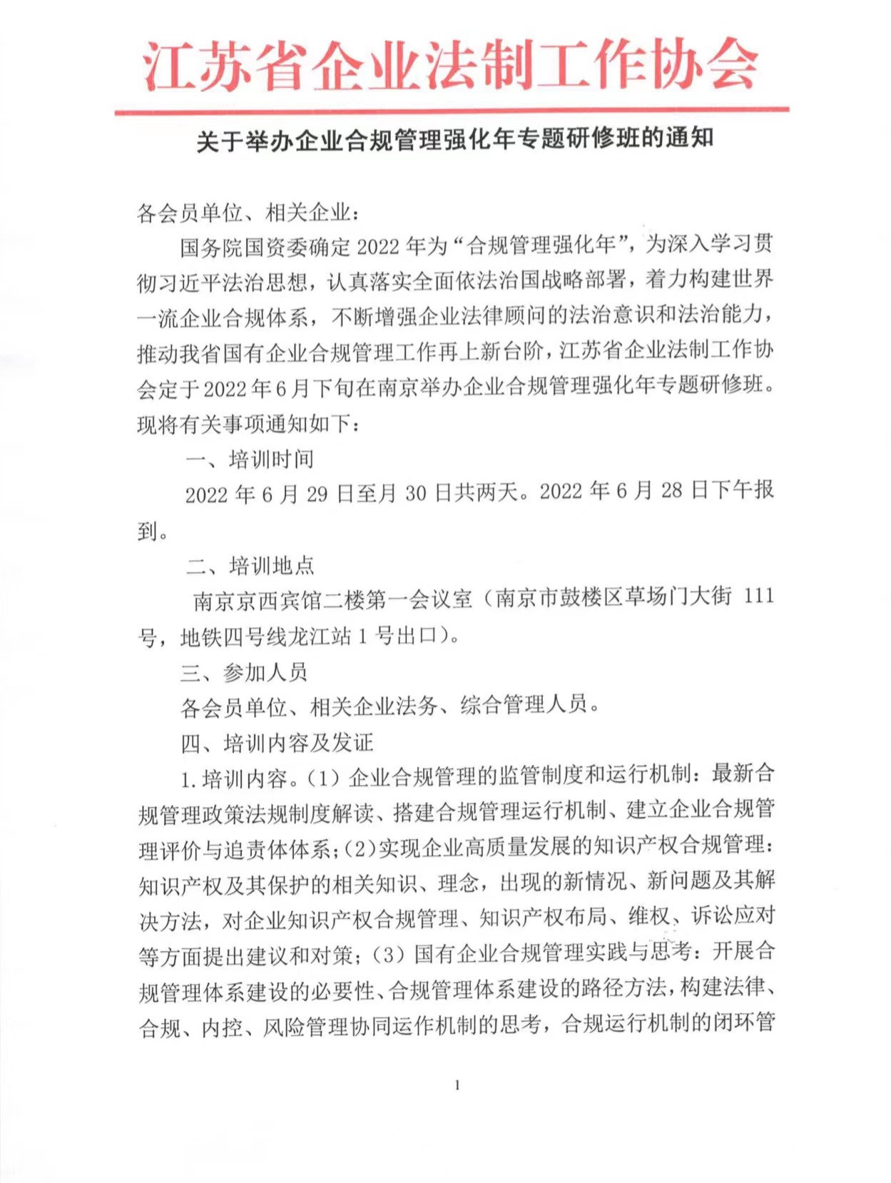 关于转发《江苏省企业法制工作协会 2022合 规管理强化年专题研修班通知》的通知