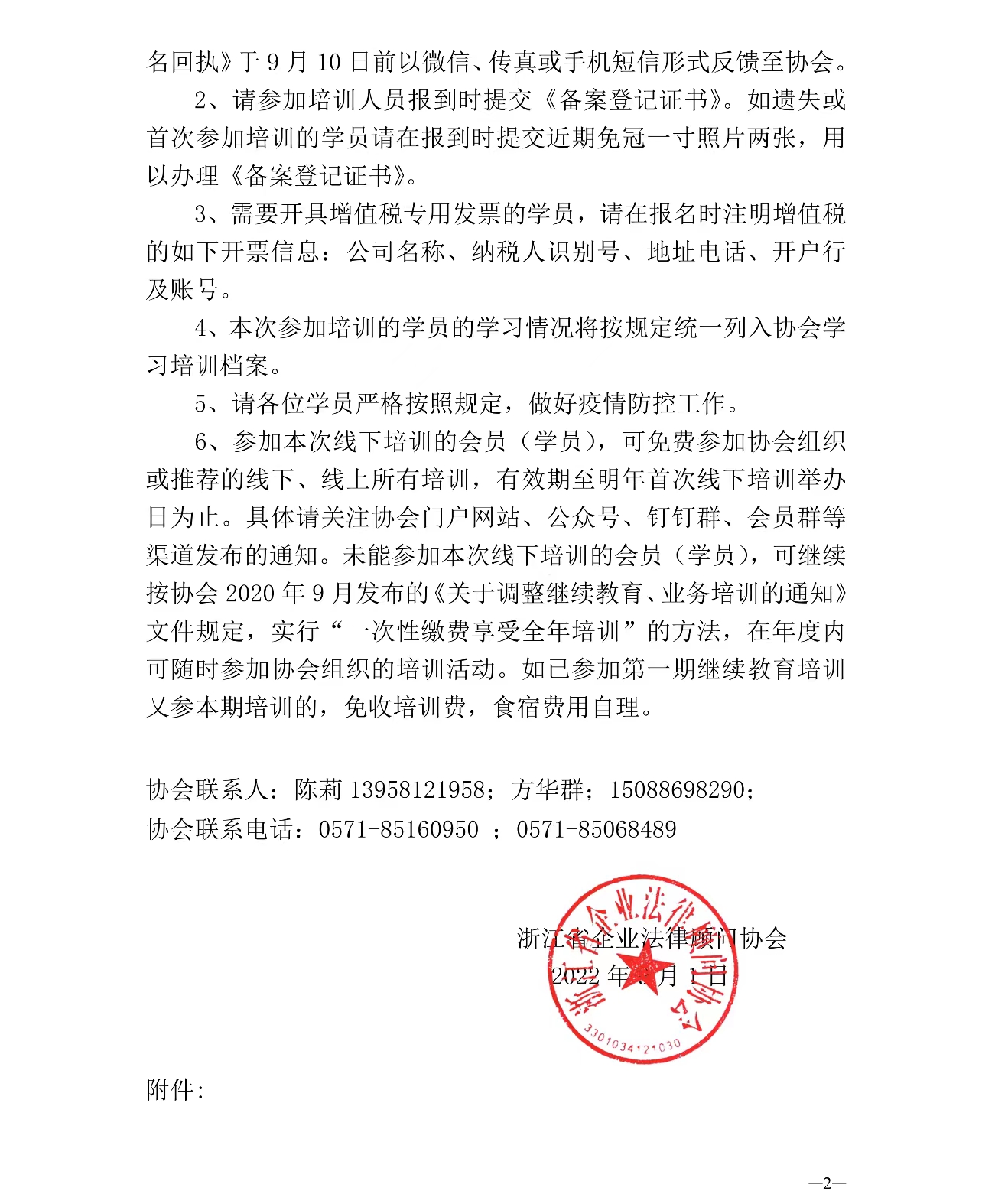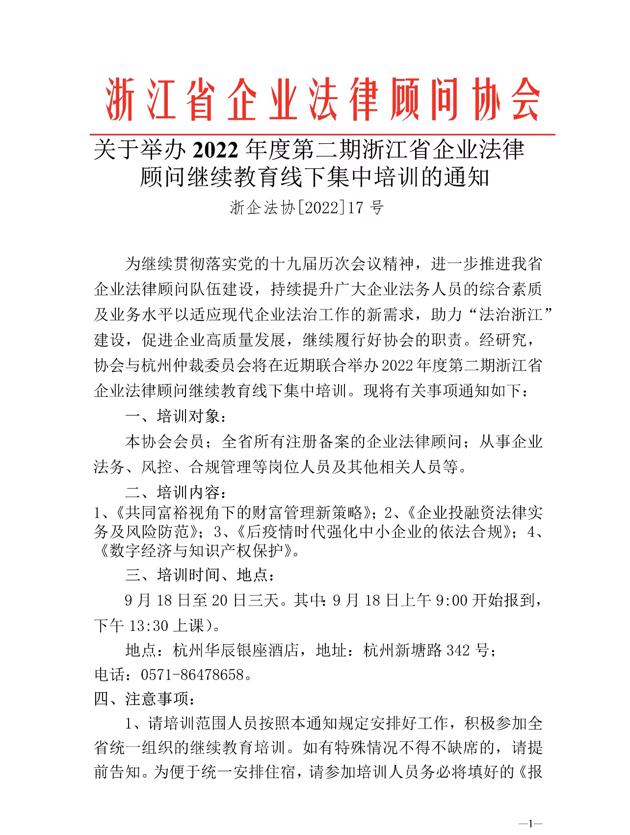 关于举办2022年度第二期浙江省企业法律 顾问继续教育线下集中培训的通知