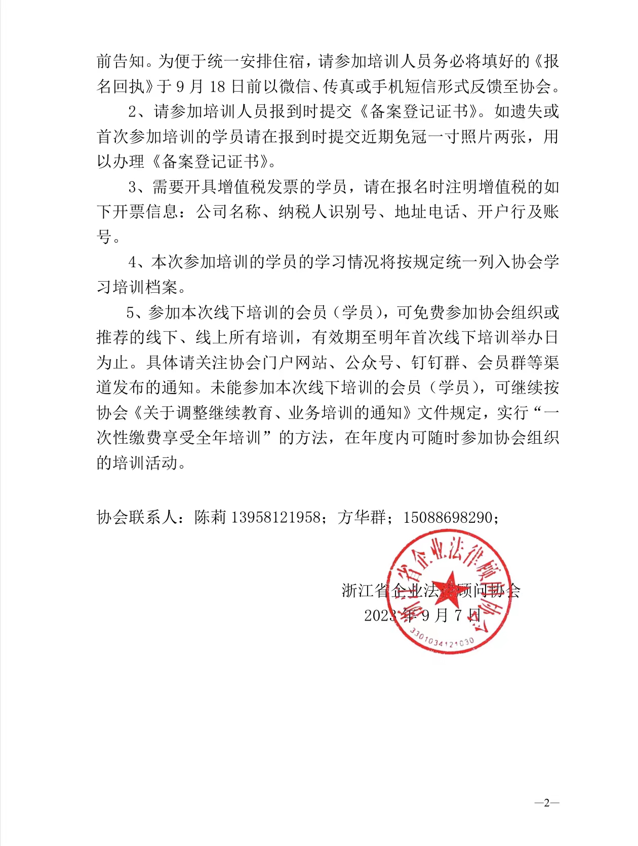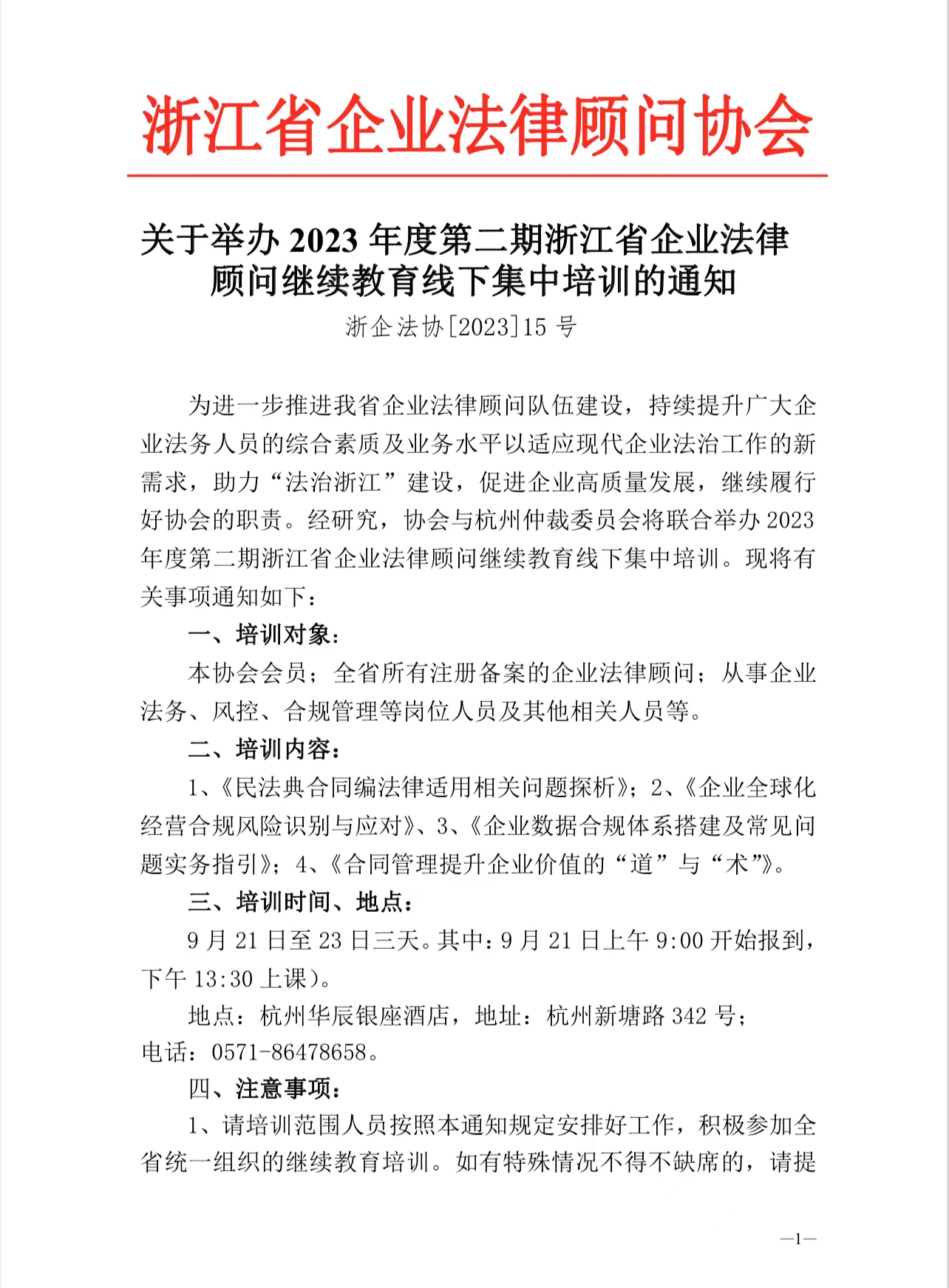 关于举办 2023 年度第二期浙江省企业法律 顾问继续教育线下集中培训的通知