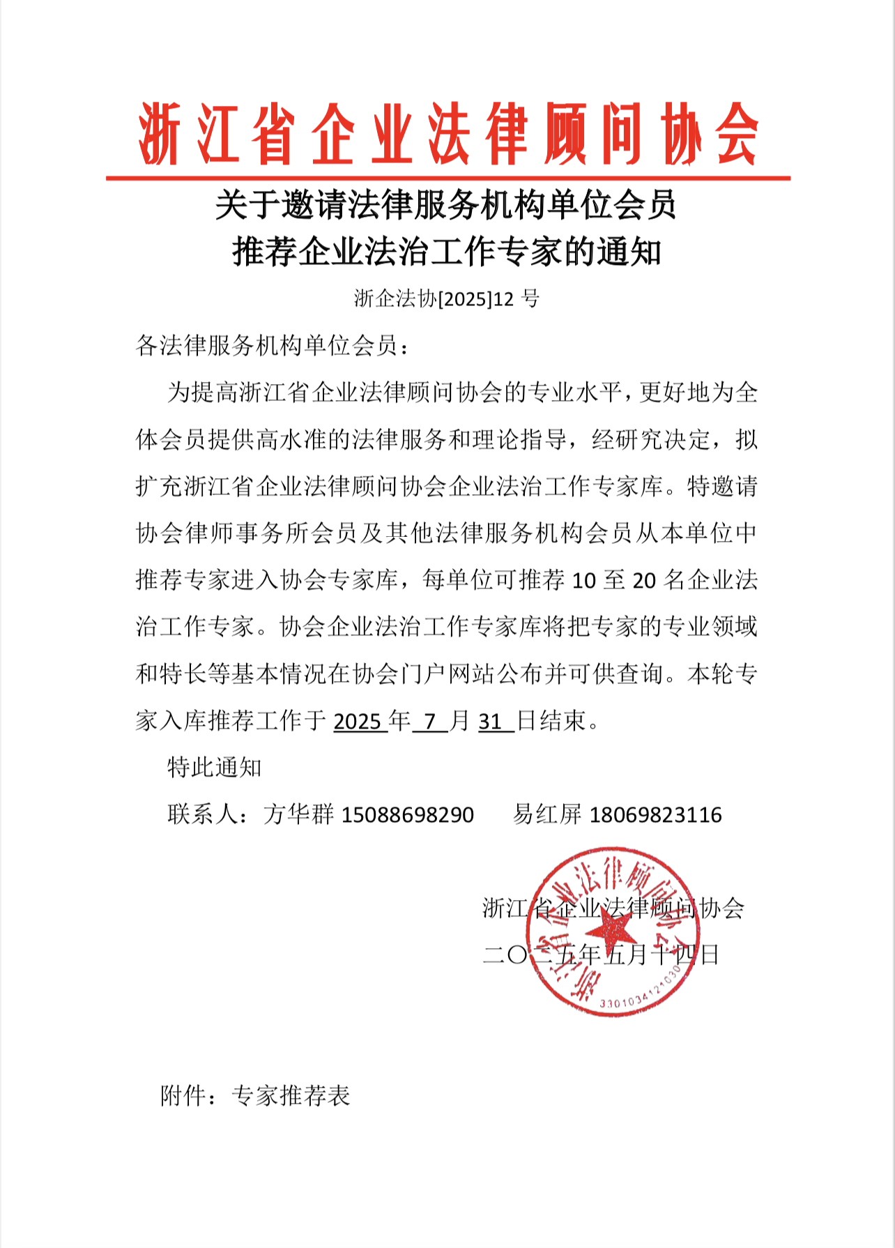 关于邀请法律服务机构单位会员 推荐企业法治工作专家的通知