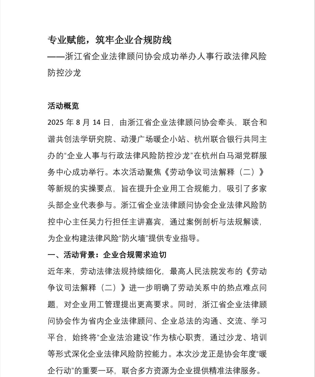 专业赋能,筑牢企业合规防线 ——浙江省企业法律顾问协会成功举办人事行政法律风险防控沙龙