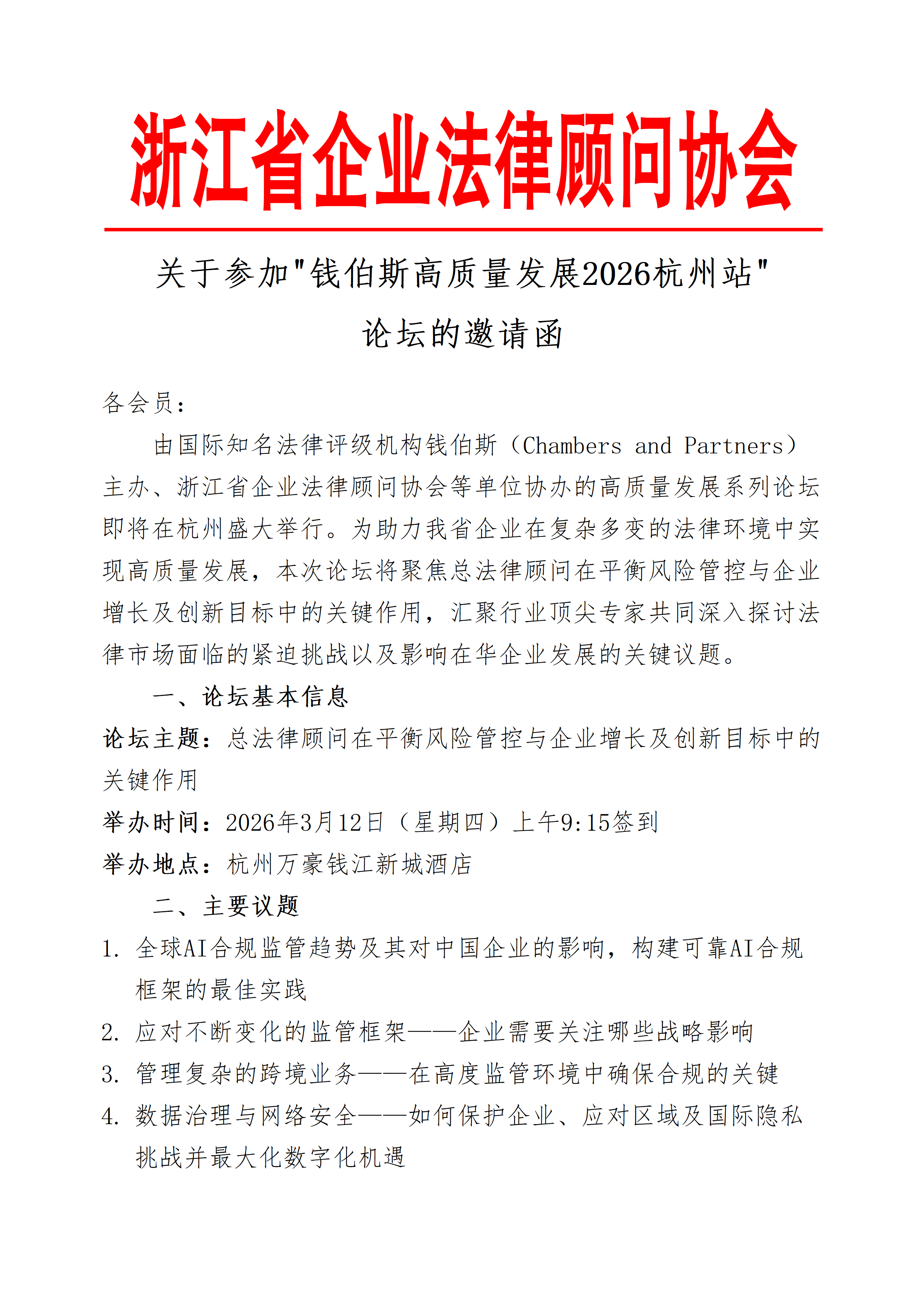 关于参加"钱伯斯高质量发展2026杭州站" 论坛的邀请函