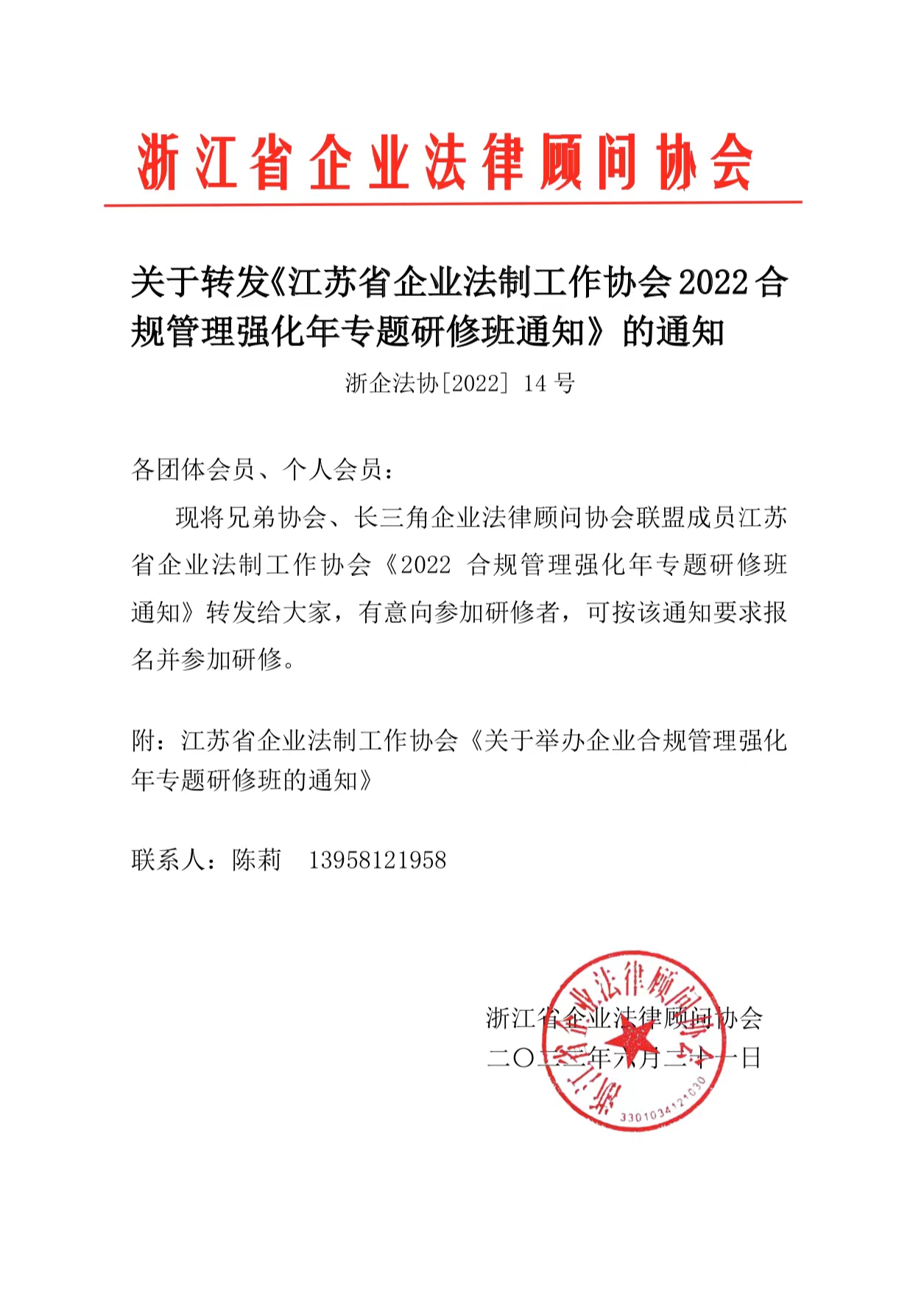 关于转发《江苏省企业法制工作协会 2022合 规管理强化年专题研修班通知》的通知