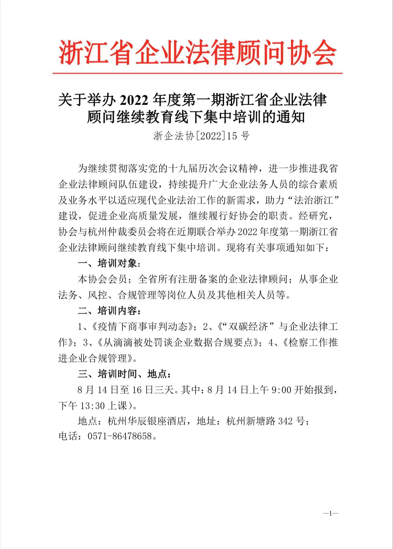关于举办2022年度第一期浙江省企业法律 顾问继续教育线下集中培训的通知
