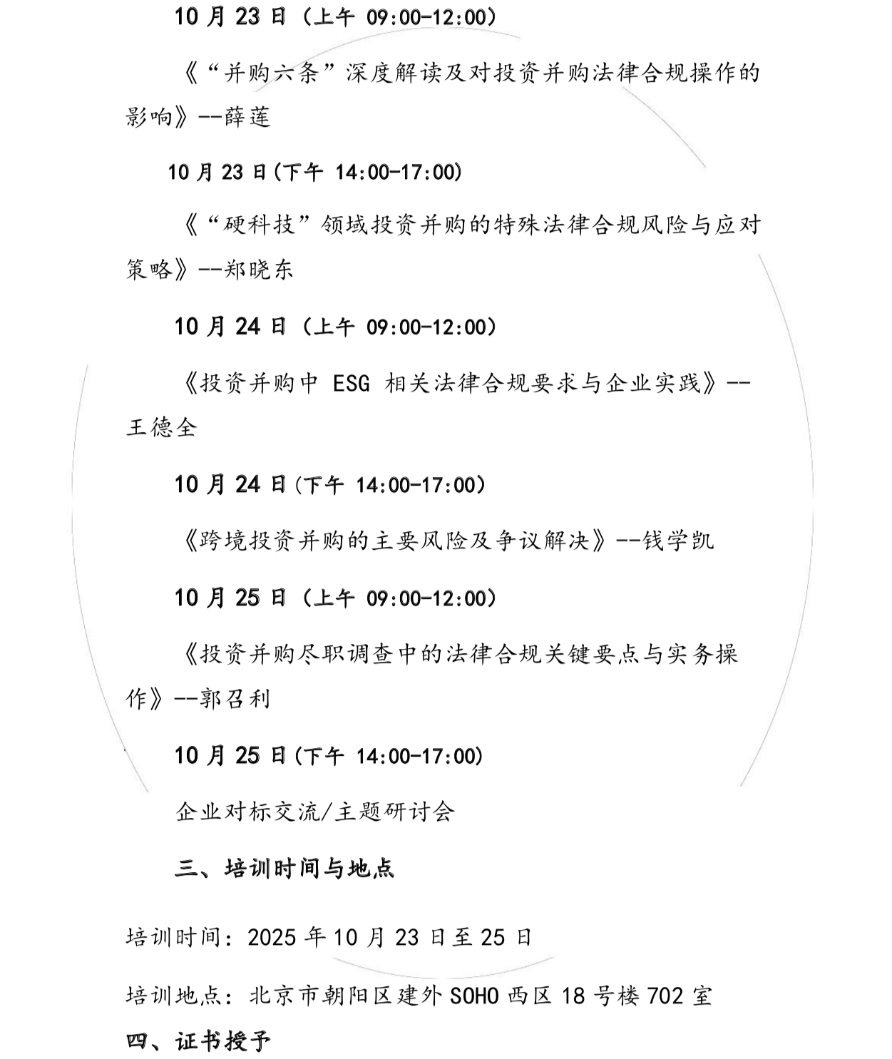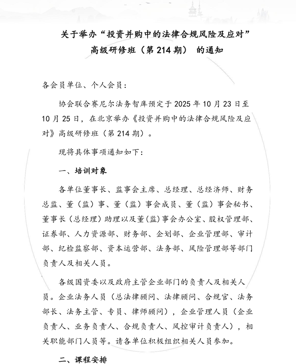 关于举办“投资并购中的法律合规风险及应对” 高级研修班(第214期) 的通知